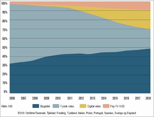 I skemaet herunder kan fordelingen af filmbranchens indtægter iagttages. Indtægterne er fordelt på biograf, fysisk video (dvd), digital video (streaming) og pay-tv vod (video on demand) i perioden 2006 til 2014 samt estimat for perioden 2015 til 2018. Oplysningerne er af det engelske analyseinstitut IHS indhentet fra ti europæiske lande: Danmark, Tjekkiet, Frankrig, Tyskland, Italien, Polen, Portugal, Spanien, Sverige og England.