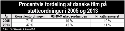 I 2013 så det radikalt anderledes ud: Af de 19 biografspillefilm produceret, var ni film støttet gennem konsulentordningen, otte film havde fået populærkulturel støtte, og to film var kommet til verden uden staten som fødselshjælper.
