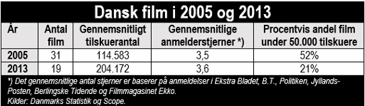 Når man sammenligner årene 2005 og 2013, vil man kunne konstatere, at filmene i 2005 gennemsnitligt blev set af 114.583, og i 2013 var tallet næsten dobbelt så højt, nemlig 204.172.