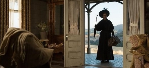 Da P.L. Travers’ moster (Rachel Griffiths) står i døråbningen, er inspirationskilden til Mary Poppins til at få øje på.