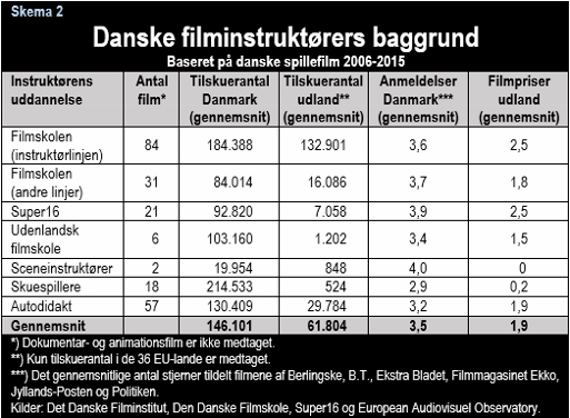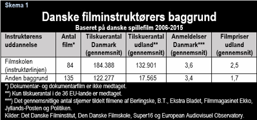 På alle parametre slår instruktører fra Filmskolen instruktører med anden baggrund. Det gælder tilskuerantal i Danmark og især i udlandet, det gælder også filmpriser i udlandet, og filmskoleinstruktører får også bedre anmeldelser i Danmark, selv om der her næsten er tale om dødt løb.