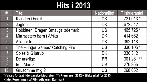 Bemærkelsesværdigt er det da også, at franske De urørlige, som havde premiere i 2012, formåede at gøre sig gældende på top ti for 2013. Filmen er i alt blevet set af 672.182 tilskuere i Danmark.