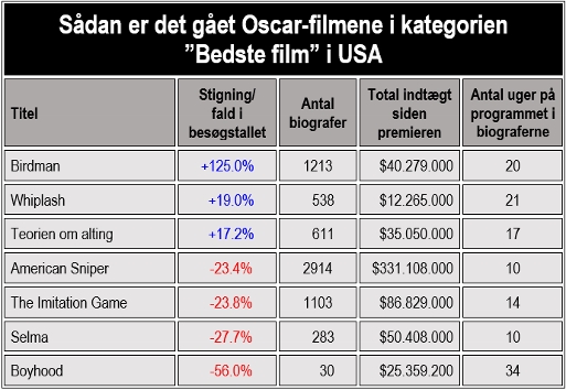 Oscar-vindende film i bedste film-kategorien har i gennemsnit scoret ekstra fjorten millioner dollars på statuetten. I år er dog en smule anderledes end tidligere, idet ingen af filmene, bortset fra American Sniper, har haft nogen særlig publikumstække. Men Birdman skal nu nok alligevel nå op på gennemsnittet.