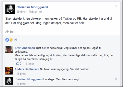 Men Monggaard følte også anledning til at fortælle sine følgere at det ”sker sjældent at jeg blokerer mennesker på Twitter og FB. Har sjældent grund til det. Har dog gjort det i dag. Ingen detaljer, men nok er nok,” og senere til sine undrende følgere kunne fortælle at ”det blev personligt”.