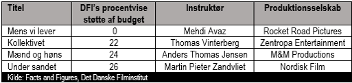 I nedenstående skema kan man iagttage udvalgte film, hvor Det Danske Filminstituts (DFI) støtte udgør en meget høj andel af budgettet.