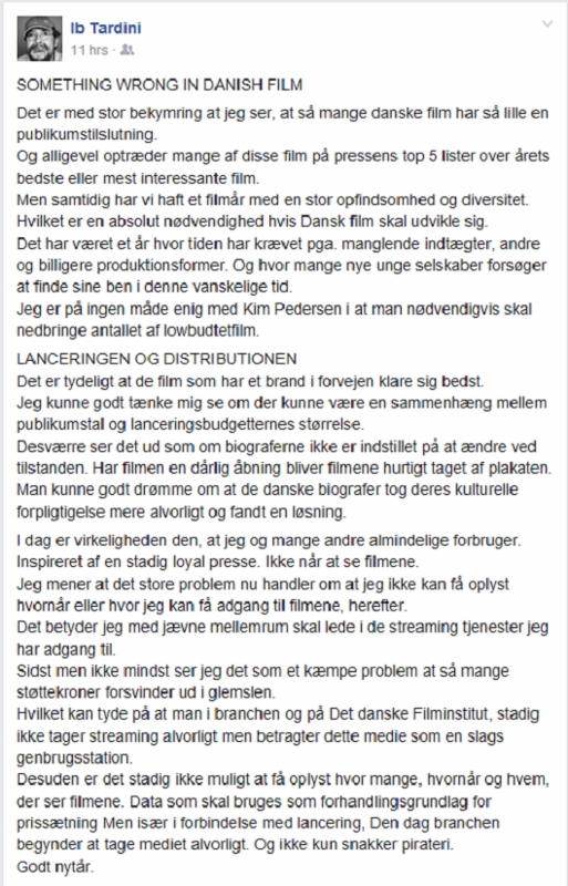 Den tidligere filmproducent og filmskolelærer, Ib Tardini, som gennem en menneskealder har beskæftiget sig med dansk film, har i forbindelse med nytåret lagt en opsigtsvækkende post op på Facebook. Den kan læses nederst i dette blogindlæg.