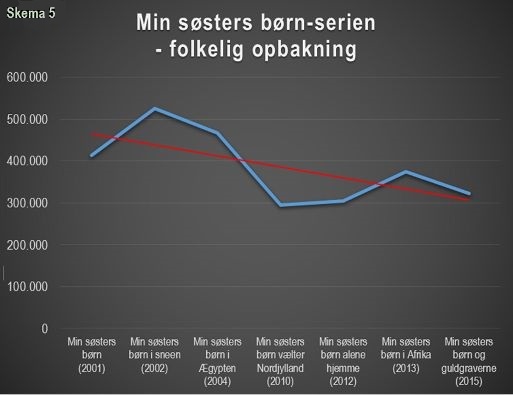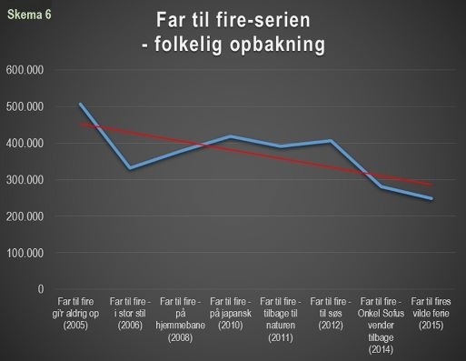 I skema 5 og 6 kan den folkelige opbakning til børnefilmenes økonomiske grundstamme – Min søsters børn og Far til fire-filmene – iagttages.