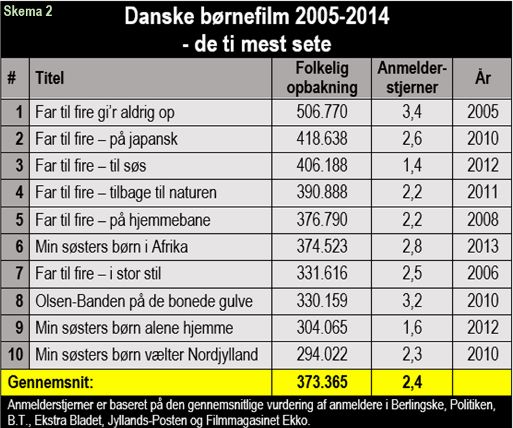 Skema 2 taler for sig selv. Ud af 63 børnefilm de sidste ti år besætter Far til fire-, Min søsters børn- og Olsen Banden-film alle pladserne på top ti. Samtlige er fortsættelser.