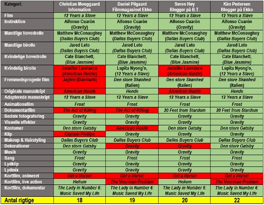 Kim Skotte, Politiken og Morten Møller Bertelsen, Filmz, afgav kun deres spådomme i henholdsvis syv og ni af de i alt 24 kategorier, hvorfor de ikke er medtaget i denne sammenhæng. Men det kan da afsløres, at Skotte havde to rigtige ud af syv, mens Bertelsen havde syv ud af ni.