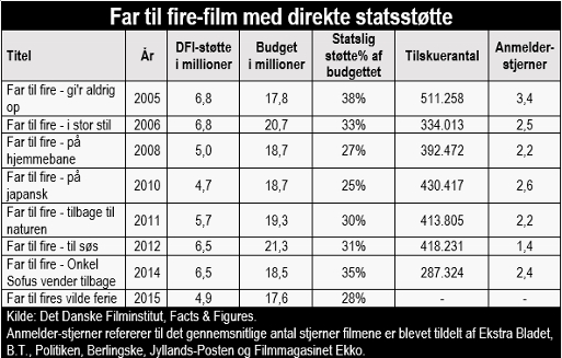Men der skal så sandelig også være plads til Far til Fire-filmene, som staten støtter med gennemsnitligt beskedne 31% af budgettet. Det giver en statslig støtte på uanselige femten kroner pr. tilskuer.
