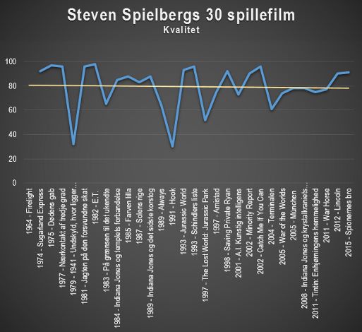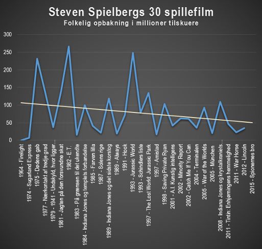 Nedenstående graf viser den folkelige opbakning til alle Spielbergs spillefilm. Som man kan se, er instruktørens tilskuermæssige tiltrækningskraft for nedadgående. Ikke siden 1993 har han for alvor ramt jackpot. Men de fleste instruktører ville være ovenud lykkelige over at få et antal publikummer, der tangerer Spielbergs mindst sete.