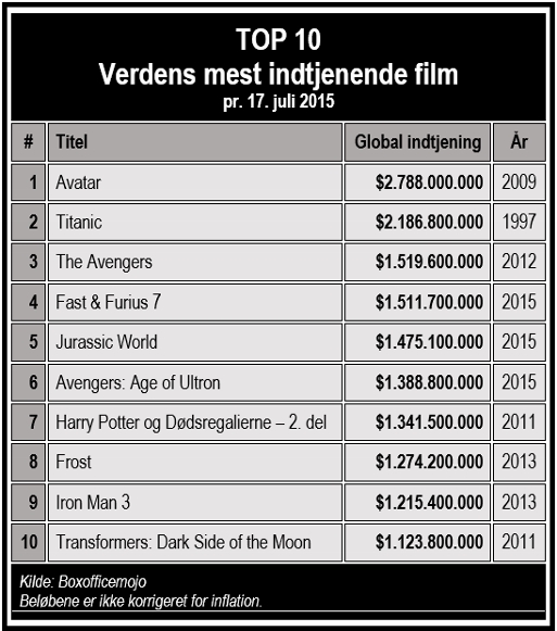 Se listen over de ti mest indtjenende film i verdenshistorien nederst i denne blog. Bemærk, at beløbene på listen ikke er korrigeret for inflation. Hvis man korrigerede for inflation, ville listen se ganske anderledes ud, og go’e gamle Borte med blæsten ville fortsat være konge.