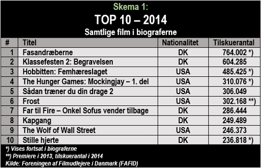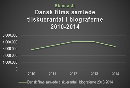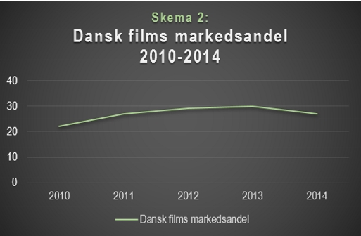 I skema 2 kan kurven med dansk films flotte markedsandel gennem de seneste fem år ses. En hjemmemarkedsandel på 26,5 procent i 2014 er helt unik og overgås kun af få lande i verden.