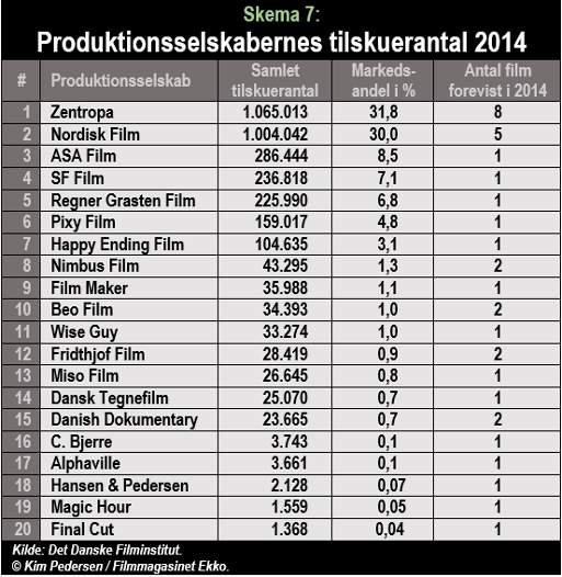 Den mest dramatiske udvikling i 2014 er dog, at Zentropa og Nordisk Film nu totalt dominerer dansk film. De to selskabers markedsandel er helt oppe på 62 procent, og det forekommer de øvrige produktionsselskaber er sejlet agterud.