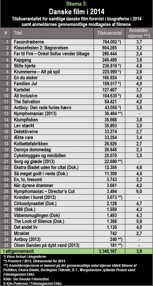 I skema 5 kan man iagttage samtlige danske films præstation i det forløbne år. Og det gælder både tilskuerantallet og anmeldernes gennemsnitlige vurdering af filmene. Her bliver det ligeledes afsløret, at dansk dokumentarfilm løfter det kvalitetsmæssige gennemsnit kraftigt i vejret.