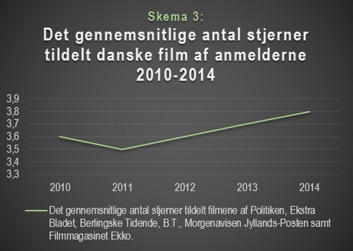 Skema 3 viser dansk films ubrudte kvalitetsstigning siden 2011. Aldrig har den gennemsnitlige kvalitet været højere – i al fald ikke, hvis man tager de toneangivende mediers mening for gode varer, og hvis man inkluderer samtlige danske spille- og dokumentarfilm, som har haft premiere i biograferne.