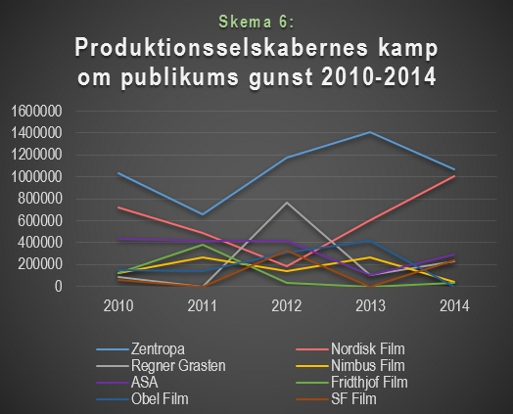 Se udviklingen blandt de toneangivne filmselskaber i skema 6.