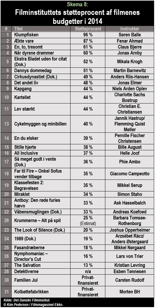 Skema 8 viser Filminstituttets støtteprocent på årets udsendte film i biograferne.